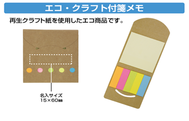 ●お申込みは100個から100個単位でお願いします。 ●材質:再生クラフト紙、紙 ●サイズ:85×80×7mm ●備考:メモ付箋25枚、スティック付箋5種×25枚、PP袋入 ●納期:約1ヶ月 |